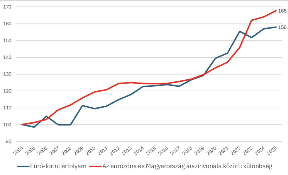 Since the country’s accession to the EU in 2004 until 2024, the exchange rate of the forint against the euro was fundamentally driven by the inflation differential between the eurozone and Hungary. In practice, this resulted in the domestic currency devaluing to the extent that the rate of price increases in Hungary exceeded the rate of price increases in the eurozone. Since 2004, prices have increased by 68% more in our country than in the eurozone, while the forint has depreciated by 58% against the euro. However, from 2023 the two indicators began to diverge, i.e. the higher domestic inflation compared to the eurozone was increasingly reflected in the exchange rate change (i.e. the forint appreciated relatively). In 2025, the inflation difference between the eurozone and Hungary’s data was 2.3 percentage points, while the annual average exchange rate of the euro increased from 395.3 to only 397.8, an increase of only 0.6%. In 2025, the difference between the two indicators became 10 percentage points.