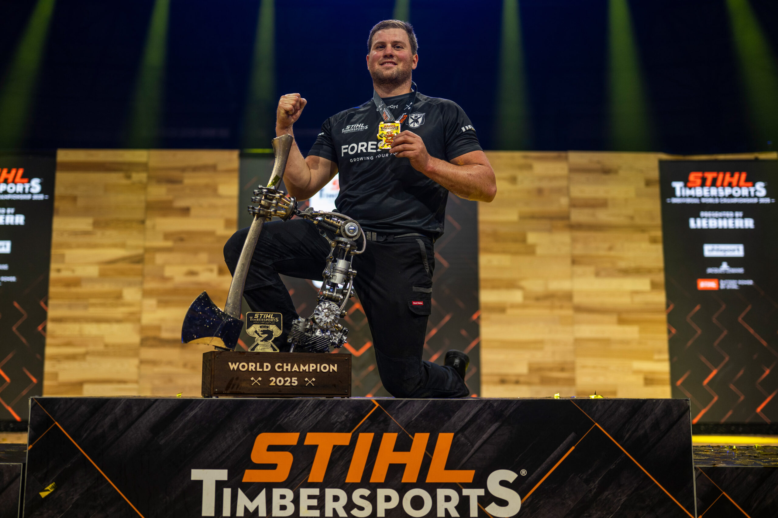 In the World Trophy format, two sports lumberjacks compete simultaneously in four events, which they must complete without interruption, against a time limit.
