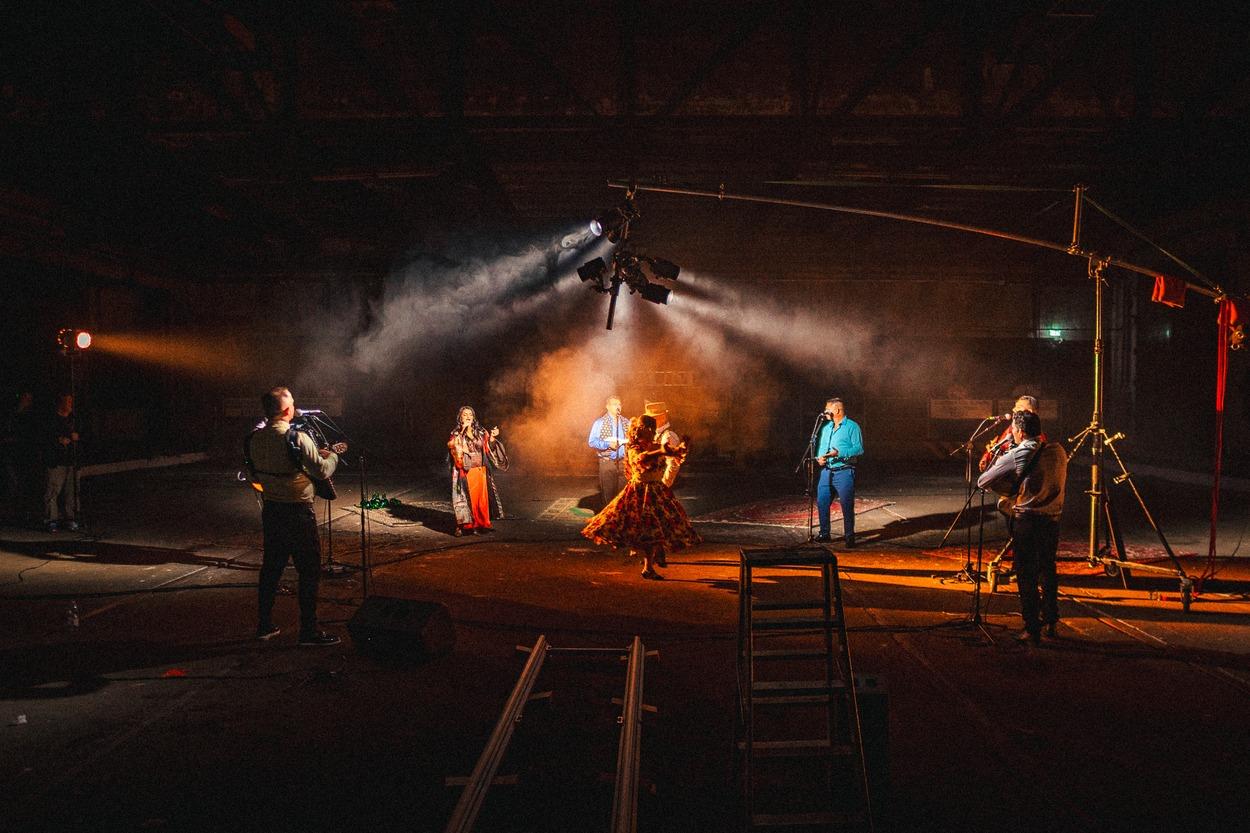 The level of the performance was further enhanced by the special filming location chosen for the occasion, as well as the director Dániel Hevér, creator of the feature film Some Birds, who joined the production as a director and was inspired by the uniqueness of the Parno Graszt team and their music that moved the audience. “During the filming, my concept was to create an elemental, slightly magical world, and the minimalism and industrial nature of the Transport Museum were perfect for this. I felt it was important to visually separate the three songs, which differ in their themes, and to give each of them an emphasised element that helps in storytelling – luminous clouds, a bus, or dancers.” – Dániel Hevér shared his creative ideas.