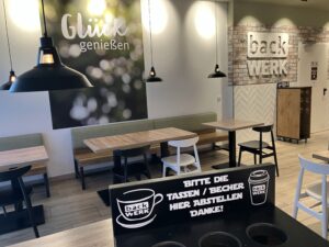 BackWerk’s interior design highlights functionality with a warm, minimalist atmosphere. The seating area supports short coffee or snack pauses during daily routines