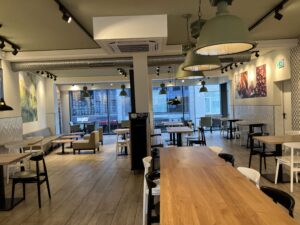 BackWerk’s upper floor offers distinct seating zones, from a large communal table to a lounge with sofas and classic café tables. This zoning extends the brand’s hybrid positioning, combining quick convenience with a place to dwell