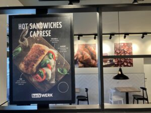 Prominent in-store communication advertises freshly prepared meal options such as hot sandwiches like the Caprese, emphasizing the fast-casual dimension to BackWerk’s bakery core