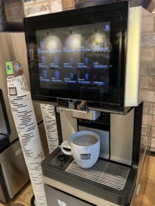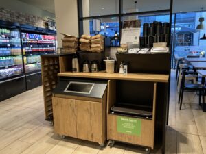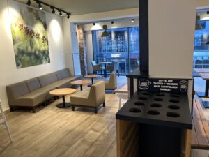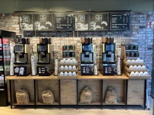 With multiple coffee machines positioned at the entrance, BackWerk enables fast service during morning rush hours. The setup supports both takeaway cups and in-store mugs, offering a clear takeaway or sit-in choice
