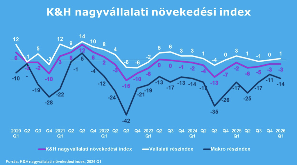 The K&H large corporate growth index shows no significant shift compared to the previous quarter: similarly to the previous quarter, it now stands at -3 points. Although the upward trend measured since the middle of last year is now expected to continue, the stagnation implies a kind of healthy wait-and-see attitude on the part of company managers. The macroeconomic subindex currently stands at -14 points; The slight decline in the indicator does not mean a decline, but indicates that the improvement of recent quarters has entered a stabilization phase. In parallel, the corporate sub-index, which includes microeconomic factors, strengthened to 1 point, which reflects a small but definitely positive shift compared to the fourth quarter of 2025.