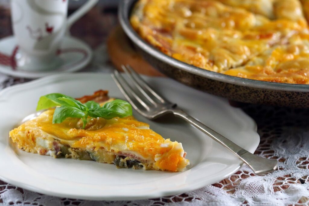 Cut the eggplant into half-inch rings. Dry fry on both sides. Place in a pizza pan (or baking sheet). Season with salt and pepper. Cover with ham. Sprinkle with grated cheese. Pour over the eggs lightly beaten with coconut oil, seasoned with salt and cracked pepper. Bake in a preheated oven at 200°C for 12-15 minutes. It is good when the middle is no longer runny. Delicious both cold and hot.
