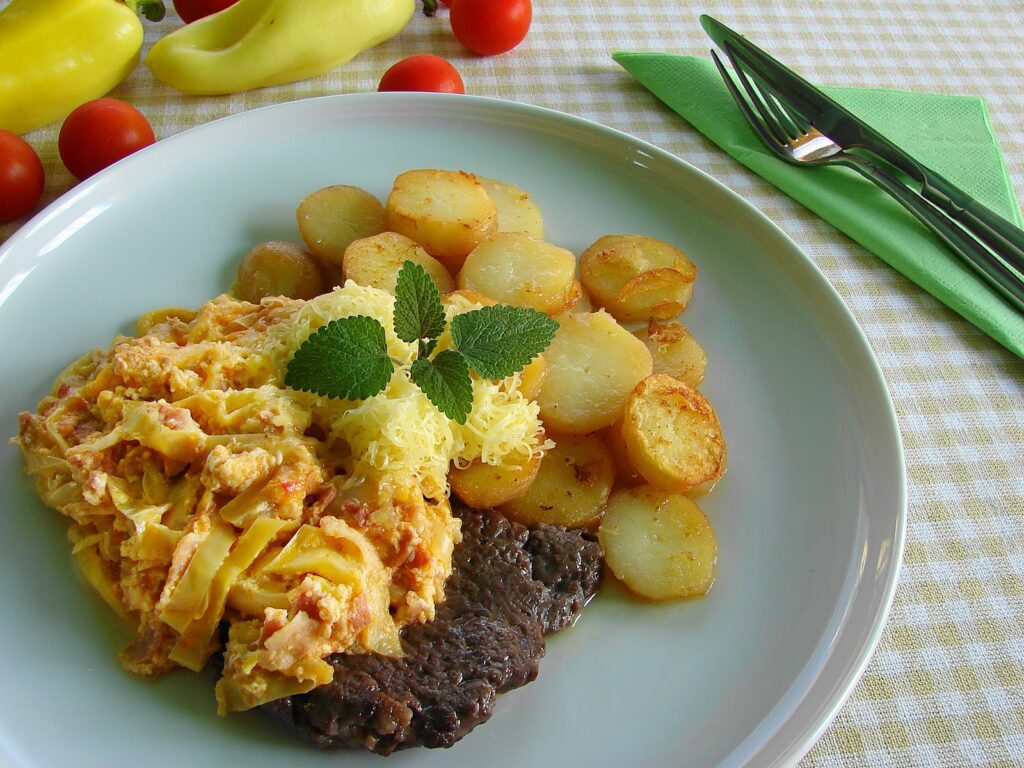 First, prepare the lecsó. Sauté the red onion cut into rings with a pinch of salt in the heated oil until translucent. Add the bacon cut into thin strips and fry together for a few minutes. Remove from the heat, stir in the red pepper, then pour a little water over the heat and fry in its fat. Add the thinly sliced pepper and tomatoes. Season with salt and cracked pepper. Simmer over low heat until done. Lightly beat the eggs with a pinch of salt. Pour into the finished lecsó and fry together until the lecsó has the consistency of scrambled eggs. While the lecsó is cooking, slice the beef. Beat it. Season with salt and pepper. Fry both sides well in the heated oil. When serving, pile the egg lecsó on the slices of meat, and finally sprinkle generously with grated cheese. Serve with roasted potatoes as a side dish.