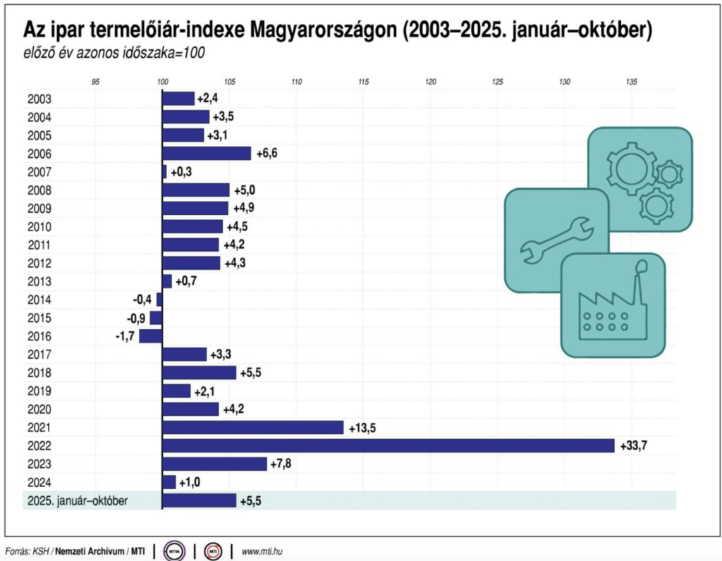 In October 2025, industrial producer prices were on average 1.8 percent higher than a year earlier. Domestic sales prices increased by 0.9 percent and export sales by 2.2 percent compared to October of the previous year, the Central Statistical Office (KSH) reported on Friday.