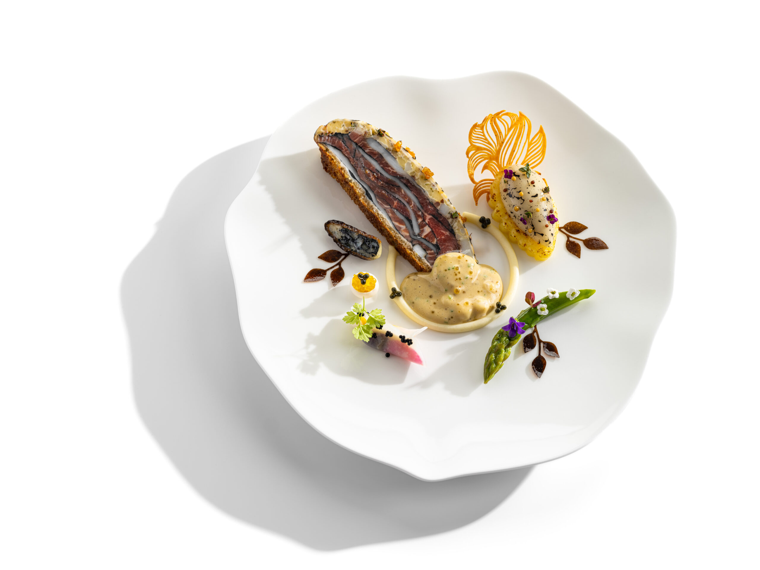 The Plate theme it was built around the idea of Surf ’n Turf in a Hungarian garden: squid and beef tenderloin met, combined with Hungarian smoked cheese, citrus notes and fresh herbs. The side dishes evoked the arrival of spring: new potatoes, green asparagus and kohlrabi appeared on the plate, emphasizing the seasonal richness of Hungarian gardens.