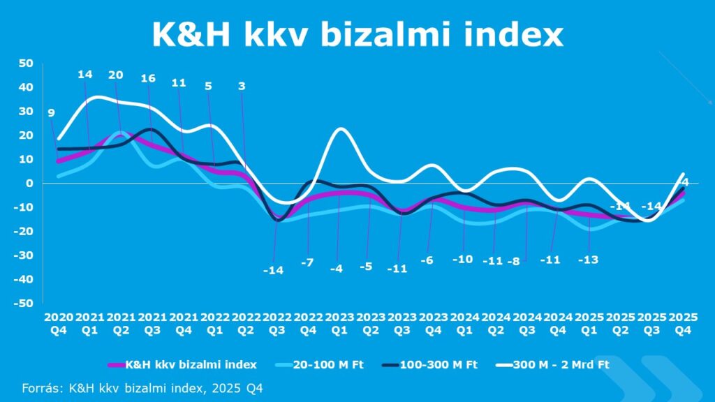 Expectations of the domestic SME sector have improved significantly by the end of the year – this is revealed by the research conducted by K&H’s SME Confidence Index in the fourth quarter of 2025, which presents the segment’s economic expectations based on the responses of 400 domestic small and medium-sized enterprises. The value of the confidence index increased by 10 points compared to the previous two quarters, so it currently stands at -4 points.