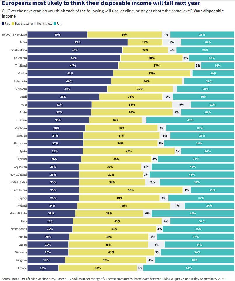 People in France are the most likely to think they will have less money to spend after bills in the next year. Forty-four per cent think their disposable income will decline in the next year. While 41% in France think their standard of living will fall in 2026, which is up 4pp since autumn last year.