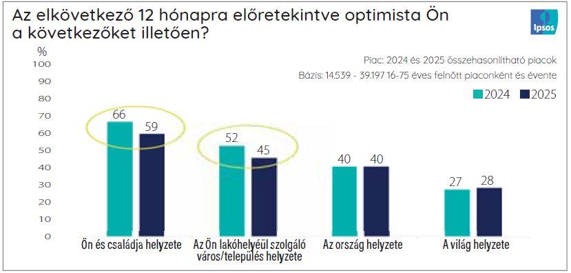 A felmérés egyik legsúlyosabb megállapítása, hogy a lakosság saját és családja, valamint lakóhelye helyzetével kapcsolatos optimizmusa meglepő mértékben (7 százalékponttal) visszaesett. E borúlátás nem újkeletű, de az elmúlt évben különösen szembeötlővé vált, hogy egyre kevesebben érzik úgy, a következő időszak pozitív változásokat hozhat.