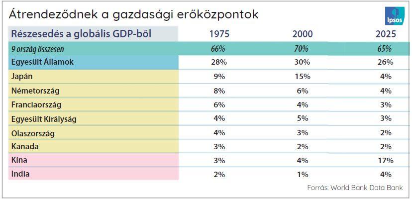 A gazdaság, ha nem is állt a feje tetejére, újrakalibrálásra szorul a mai, eddig talán megszokottnál politikailag feszültebb környezetben. Bár az Egyesült Államok továbbra is vezető szerepet tölt be, India és Kína gazdasági súlya az elmúlt 50 évben jelentősen megnőtt.