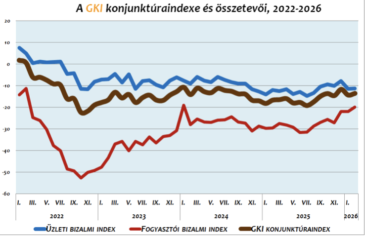 A GKI Gazdaságkutató Zrt. – az EU támogatásával végzett – felmérése szerint februárban a fogyasztók kilátásai érezhetően javultak, míg a cégeké gyakorlatilag nem változtak januárhoz képest. A kilátások összefoglaló jelzőszáma, a GKI konjunktúra indexe 1 ponttal emelkedett. A vállalkozások foglalkoztatási hajlandósága kissé gyengült, az értékesítési árak várható alakulására vonatkozó összesített várakozás enyhén mérséklődött. A válaszadó cégek az idei második hónapban a gazdálkodási környezetet valamivel kiszámíthatatlanabbnak érezték, mint januárban.