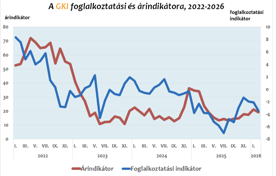 A vállalkozások összesített létszámgazdálkodási várakozását jelző foglalkoztatási indikátor 2026 második hónapjában némileg csökkent a januárihoz képest. S ezzel e mutató öthavi mélypontra esett vissza. A következő három hónapban a vállalkozások 10%-a készül a létszám bővítésére, míg 11%-a csökkentené azt. Az építőiparban és a kereskedelemben a létszám csökkentésére törekvők vannak többségben a bővítést tervezőkkel szemben.
