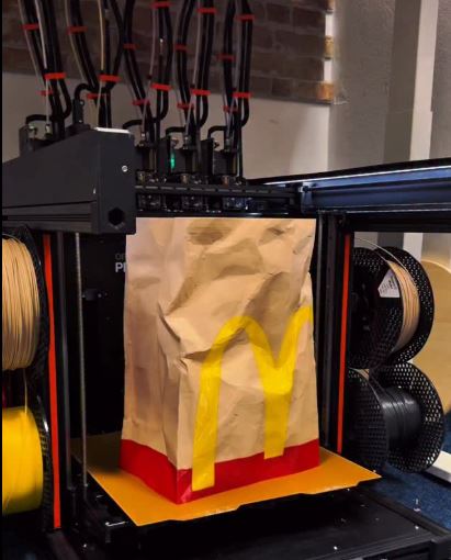 Nagyon valósághű álpapírzacskó, egy Prusa XL nyomtató készítette, merev műanyag papírszerű felülettel. Méretéből kiindulva egy konyhában biztosan nem fűszertartóként fogják használni, de annyira jópofa, hogy érdemes neki funkciót keresni. Lehet például szemeteskosár egy középiskolás szobájában…