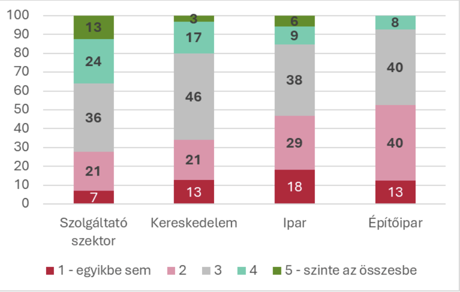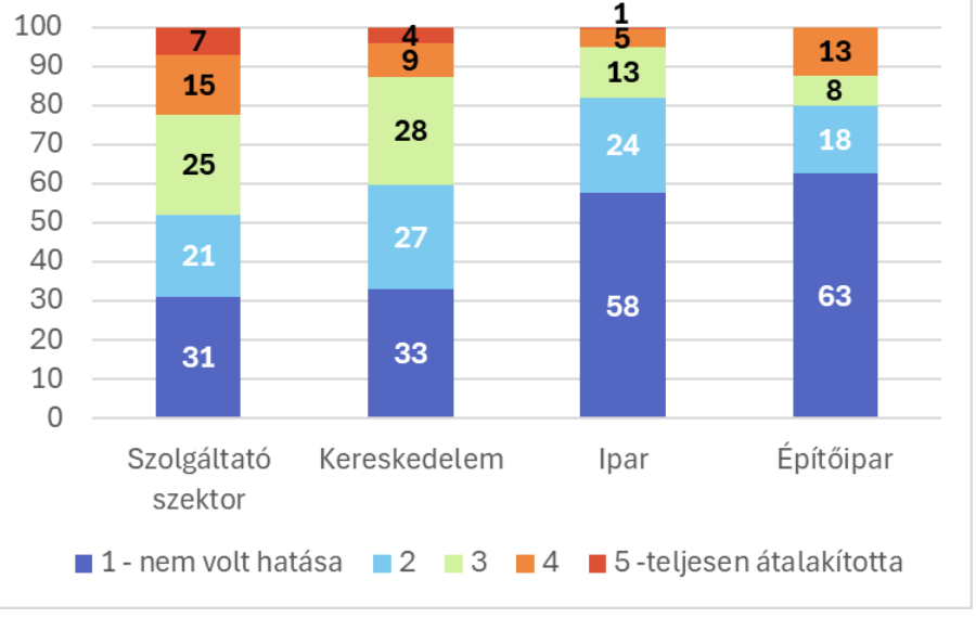 Markáns eltérés figyelhető meg az ágazatok közt: a szolgáltató szektorban és a kereskedelemben erősebb hatása volt az AI-nak, míg az iparban és az építőiparban jóval mérsékeltebb. A szolgáltató szektorban a válaszadók közel fele érzékeli az AI hatásait, ezen belül 22% jelentős, vagy teljes piaci átalakulásról számolt be. A kereskedelemben is sokan tapasztalják az AI hatásait (41%) legalább közepes szinten, itt 13% azoknak az aránya, akik nagymértékű, vagy teljes piaci átalakulást tapasztalnak.