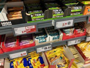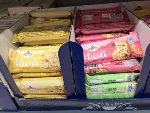 Közvetlenül ez alatt a Crownfield saját márkás müzliszeletei találhatók a breakfast‑to‑go kínálatban. A Crownfield hagyományosan a Lidl gabonaalapú saját márkája volt, de most több részlegen is megjelenik. Az reggelihez kapcsolódó gabonaalapú 40 grammos snack szeletek – köztük keto és prémium változatok – az édességosztályon kapnak helyet. Emellett magas fehérjetartalmú granola is megtalálható egy külön „Bądź fit” („Légy fitt”) felirattal ellátott gondolavégen, ahol a Lidl a magas fehérjetartalmú, hűtést nem igénylő termékeket helyezi el.