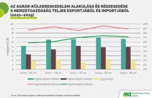 A mezőgazdasági és élelmiszeripari termékek kivitelének értéke 6679 millió eurót, behozatalának értéke 4920 millió eurót tett ki 2025 első fél évében, az agrár-külkereskedelem aktívuma 1760 millió euró volt, 374,3 millió euróval kevesebb, mint 2024 első hat hónapjában. A mezőgazdasági és élelmiszeripari termékek exportértéke 5,2 százalékkal mérséklődött, importértéke nem változott, az egyenleg 17,5 százalékkal romlott a 2024. első félévi értékhez képest.