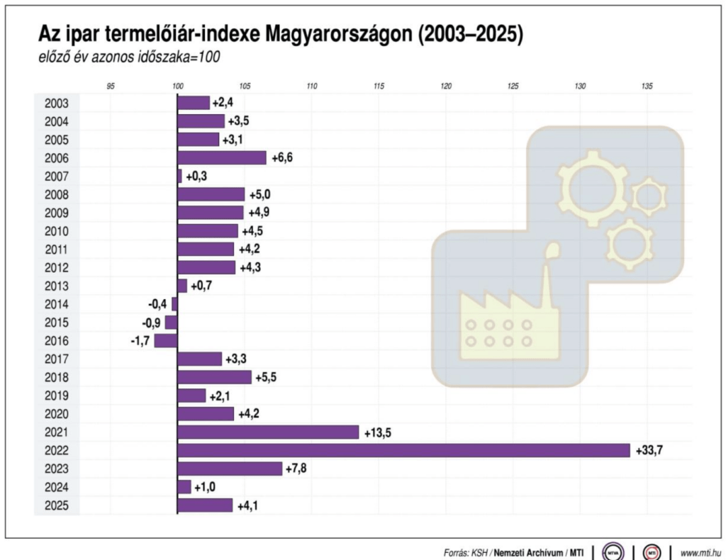 A KSH összegezte: 2025. év egészében az ipari termelői árak összességében 4,1 százalékkal magasabbak voltak az előző éviekhez képest. A belföldi értékesítési árak átlagosan 2,3 százalékkal emelkedtek, ezen belül a feldolgozóipari árak 2,5, míg az energiaipari árak 1,7 százalékkal nőttek.