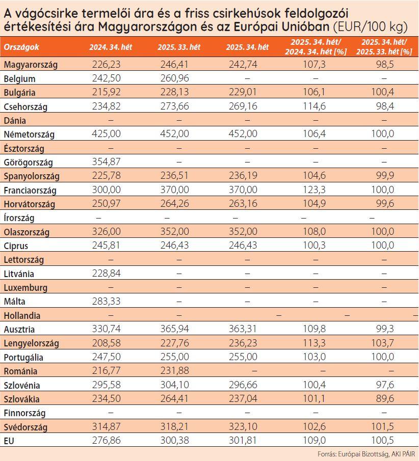 Az Európai Bizottság adatai szerint 290 euró/100 kilogramm volt az egész csirke uniós átlagára 2025 első 34 hetében, ami 8%-kal múlta felül az előző évit.