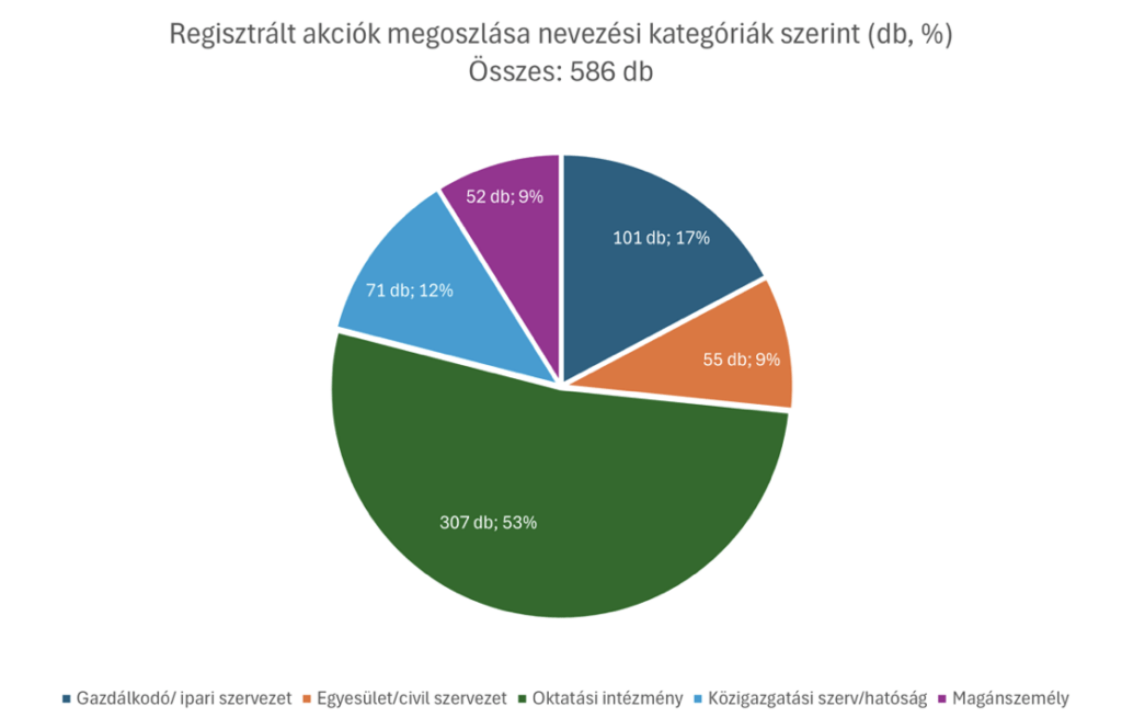A regisztrált akciók többségét (53 %-ot) a hazai oktatási intézmények alkotják, amely igazolja az intézmények, a pedagógusok és a diákok elkötelezettségét a környezeti ügyek, a környezeti nevelés iránt: