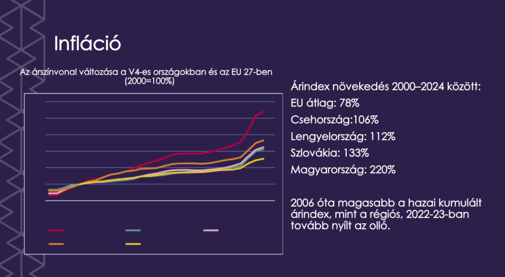 2000–2024 között Magyarországon nőtt leginkább az árszint a V4-ben: +220%, miközben az EU27 átlaga +78% (CZ +106%, PL +112%, SK +133%). A különbség 2006 óta tartós, 2022–23-ban pedig látványosan tovább szélesedett a rés