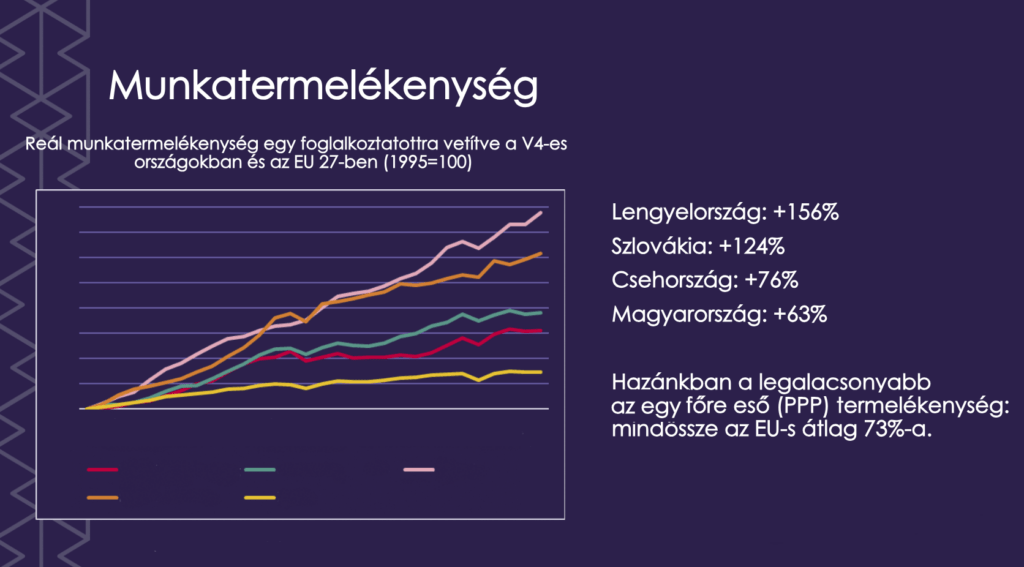 Munkatermelékenység 1995–2023: Lengyelország +156%, Szlovákia +124%, Csehország +76%, Magyarország +63% – a régiós felzárkózás gyors, de hazánk egy foglalkoztatottra jutó (PPP) termelékenysége csak az EU-átlag 73%-a