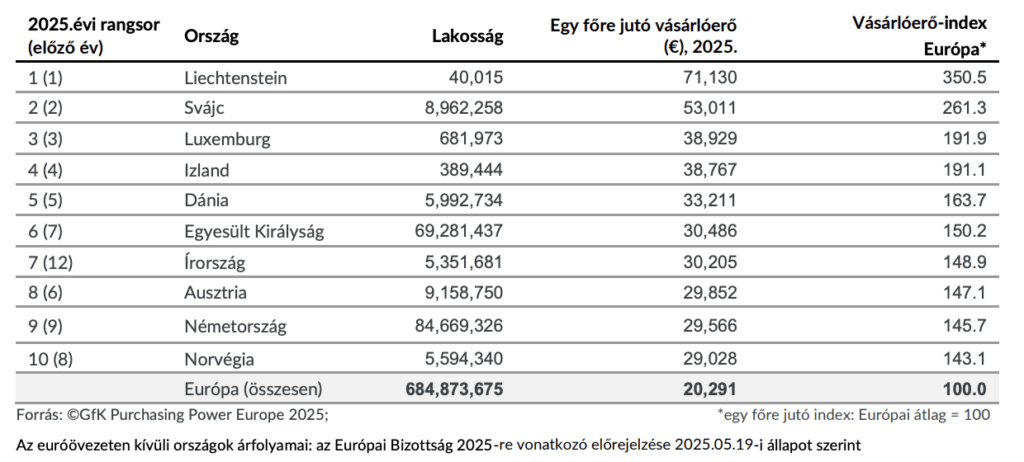 A korábbi évekhez hasonlóan Liechtenstein 2025-ben is jelentős előnnyel az első helyen áll a vásárlóerő-rangsorban. A liechtensteini lakosok egy főre jutó vásárlóereje 71.130 euró, ami 3,5-szerese az európai átlagnak. A második és harmadik helyen Svájc és Luxemburg következik. A svájciak egy főre jutó vásárlóereje 53.011 euró, ami 2,6-szorosa az európai átlagnak, míg a luxemburgiak nettó rendelkezésre álló jövedelme 38.929 euró fejenként. Ez több mint 1,9-szerese az európai átlagnak.