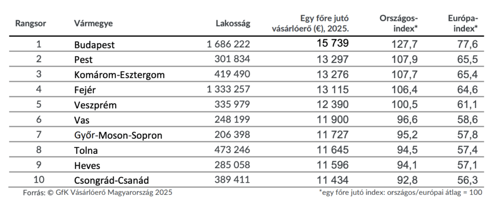 A 20 magyarországi vármegyét vizsgálva kiderül, hogy különösen az öt átlagon felüli vásárlóerővel rendelkező vármegye tudta megvédeni első helyét (Budapestet is ideértve). Ezek mindegyike a főváros környékén, vagy attól nyugatabbra található. Az egy főre jutó 15.739 eurós költési potenciállal a főváros közel 28 százalékkal az országos átlag felett egyértelműen az első helyen áll.