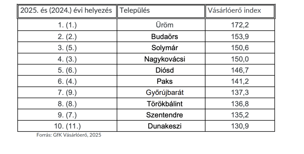 Az első tíz leggazdagabb település listáját idén újból Üröm vezeti, míg a tavalyi tizedik Nyergesújfalu kiesett a top 10-ből. Paks a hatodik helyre került, Solymár a harmadik -, míg Diósd az ötödik helyre jött föl. Az első helyezett vásárlóerő indexe 172,2 százalék, azaz 72,2 százalékkal magasabb a hazai átlagos vásárlóerőnél (az országos átlag =100).