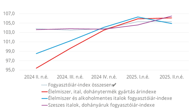 Az árindexek világosan mutatják: 2025 második negyedévében az élelmiszerek és alkoholmentes italok éves áremelkedése továbbra is 5-6% körül alakult, vagyis az árak tartósan magas szinten ragadtak. A forgalmi adatok szerint eközben a háztartások kevesebb élelmiszert vásároltak, mint az év első negyedében – vagyis az árstop nem ösztönözte a fogyasztást, sőt, a kereslet volumene csökkent.