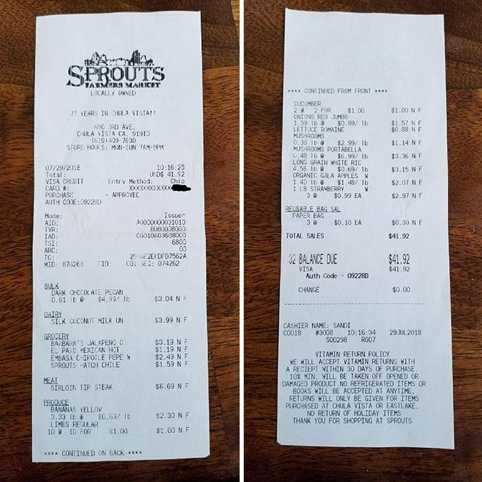 Egy kaliforniai helyi termelői áruház nyugtája – a főoldalon alul a szöveg: folytatás a hátoldalon.