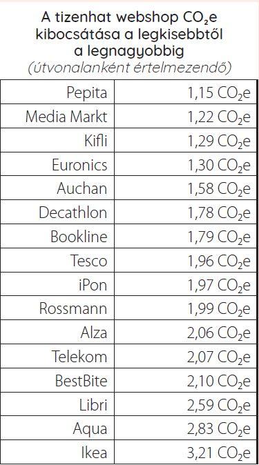 A hazai szereplők egy vásárlási útvonalon eredményezett kibocsátása rendkívül változatos. A legnagyobb kibocsátás 3,21 gramm volt, míg a legkisebb 1,15 gramm. Érdekesség, hogy a legnagyobb karbonlábnyommal rendelkező főoldal több mint hatszor annyi kibocsátást termel, mint a legkisebb. Az összes vizsgált oldal (főoldalak, terméklisták, termékoldalak) közül a legkisebb és a legnagyobb ugyanannál a kereskedőnél jelent meg.