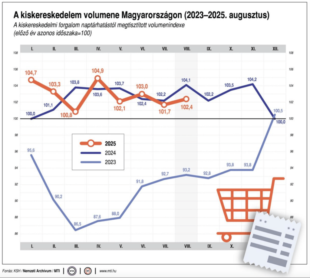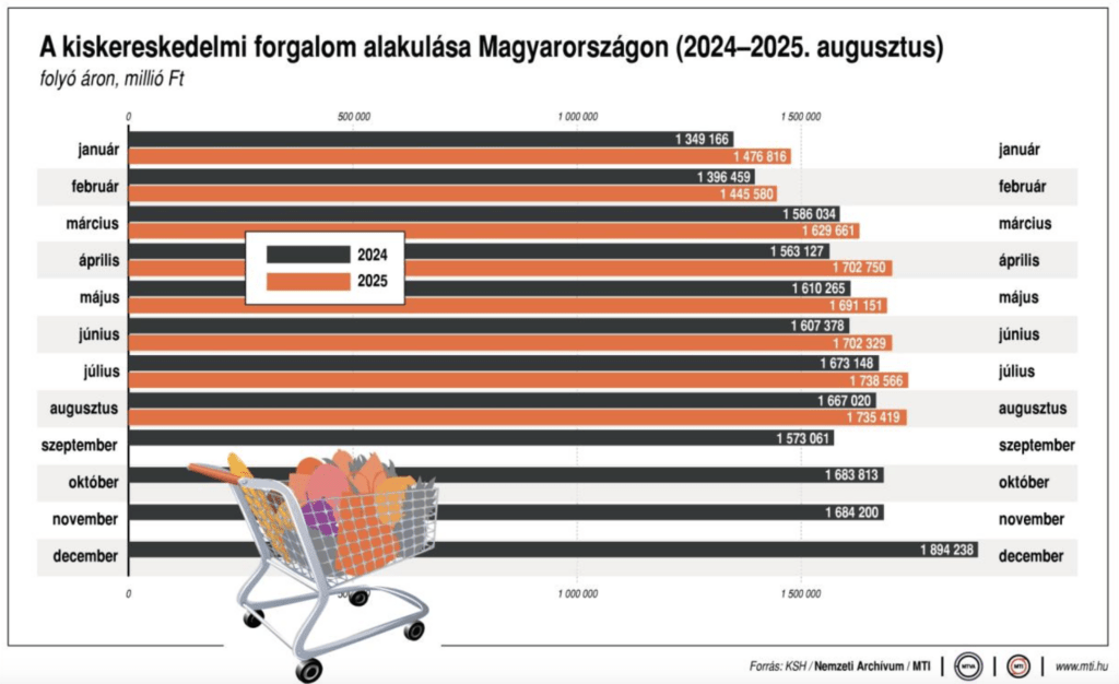 A Központi Statisztikai Hivatal (KSH) adatait idézi a minisztérium, amelyek szerint 2025 augusztusában a kiskereskedelmi forgalom volumene naptárhatástól megtisztítva az előző év azonos időszakához képest 2,4 százalékkal, a megelőző hónaphoz képest 0,8 százalékkal nőtt. Az élelmiszer- és élelmiszer jellegű vegyes üzletek értékesítési volumene 2,3 százalékkal, ezen belül az élelmiszer-kiskereskedelem 76 százalékát adó élelmiszer jellegű vegyes üzleteké 3,9 százalékkal növekedett.