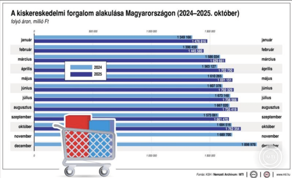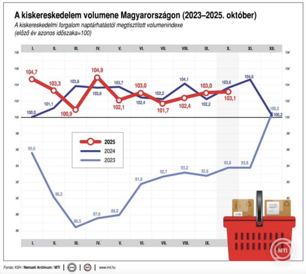 2025. októberben a kiskereskedelem forgalmának volumene a nyers és a naptárhatástól megtisztított adatok szerint egyaránt 3,1 százalékkal meghaladta az előző év azonos időszakit – jelentette csütörtökön a Központi Statisztikai Hivatal (KSH).