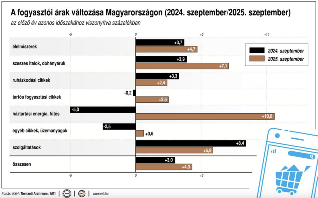 KSH: szeptemberben a fogyasztói árak az előző év azonos hónapi értékeket átlagosan 4,3 százalékkal haladták meg