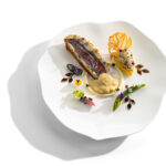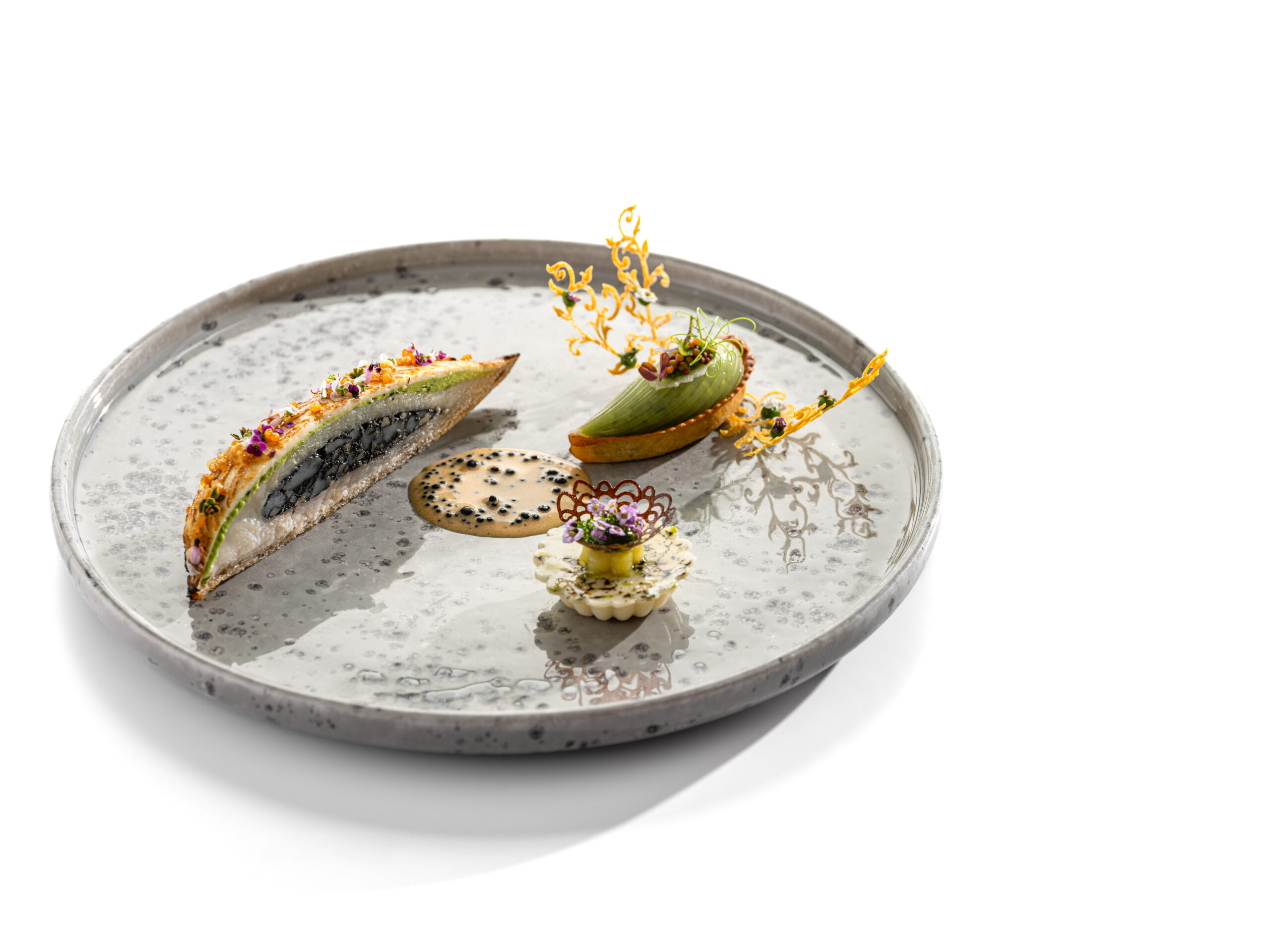 A tányértémában a magyar identitás egy másik, finomabb gesztussal jelent meg: az aioli részeként Tokaji Aszúból és annak ecetéből készült „hamis kaviár” került a fogásba, sáfránnyal fűszerezve. A Tokaji – amelyet gyakran „folyékony aranyként” emlegetnek – így játékos, mégis visszafogott módon jelent meg a verseny szigorú keretei között. A szószt gazdag magyar tejföl tette teljessé, amely világos, selymes textúrát és a magyar konyhára jellemző, lágy mélységet adott az összképnek.