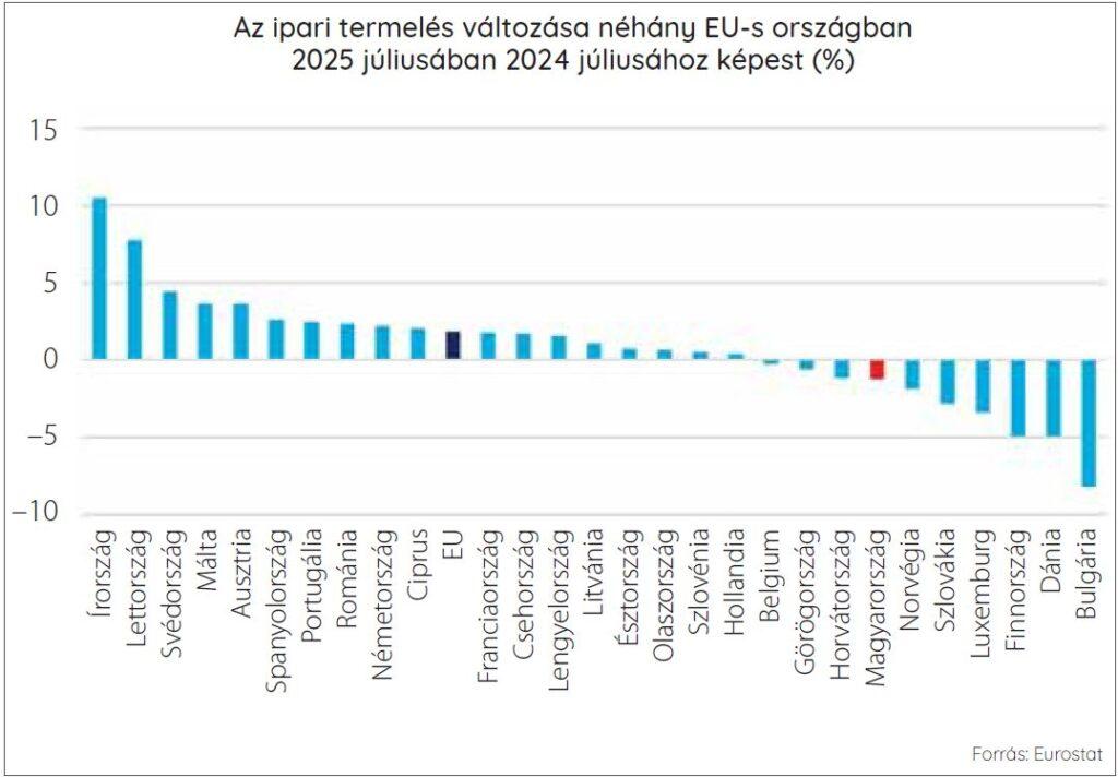 Az ipari termelés 2025 júliusában 1,8%-kal nőtt az EU-ban 2024 júliusához képest, áll a GKI friss elemzésében. Németországban az ipar idén először májusban tudott növekedni, júliusban 2,2%-os volt az éves volumengyarapodása, ami kedvező jel a magyar ipar szempontjából is. A magyar ipar termelésének csökkenése júliusban (–1,3%) a 7. legnagyobb volt az EU-ban.