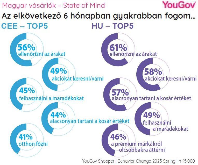 Tízből hét háztartás csak azt veszi meg, amit feltétlenül szükséges, 54% tervez élelmiszerre kevesebbet költeni, míg 58% vásárláskor különösen odafigyel az árra, és tízből mintegy nyolcan (77%) pedig keresik az akciós termékeket.