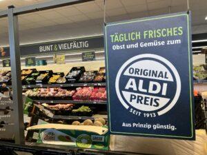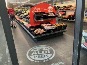 Az üzlet már a bejáratánál a padlóra vetített Original Aldi Preis seit 1913 („Eredeti Aldi ár 1913 óta”) üzenet hangsúlyozza a kereskedő árvezető pozícióját. A vásárlói út az eladótér mintegy harmadát elfoglaló zöldség-gyümölcsrészleggel kezdődik.