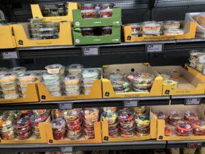 A hűtött csemege kínálat sárga, polcra kész tálcákat használ, amelyeken szerepelnek a terméknevek, leegyszerűsítve ezzel a polc előtti tájékozódást.