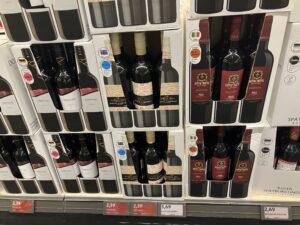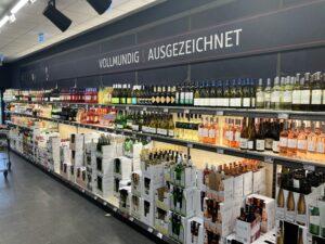 A bor részleg dedikált világítással a hátsó falat foglalja el. A három euró alatti belépő árú borok szállítódobozokban kerülnek az alsó polcokon kihelyezésre