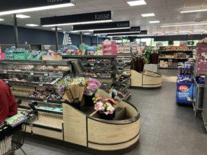 A kasszazóna íves, fa-hatású modulokkal és drótkosaras polcokkal került kialakításra, amelyek a fizetés előtti utolsó pillanatban választható snackek és kisebb kiegészítők elhelyezésére szolgálnak. A friss virágok hangsúlyos megjelenéssel ösztönzik az impulzusvásárlásokat.