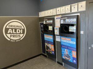 A visszaváltó automata közvetlenül a bejáratnál kapott helyet, a szabályokat jól láthatóan megjelenítő táblák és munkáltatóimárka-üzenetek által keretezve. A betétdíjas visszaváltás és a toborzó plakátok kombinációja a diszkontlánc pragmatikus, hatékonyságorientált kommunikációs stílusát tükrözi.