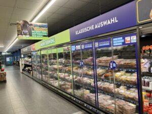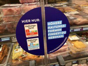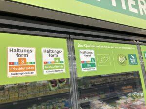 Az alap Haltungsform 1. és 2. szintet hier nur („csak itt”) felirat jelzi a hűtőajtókon, a vásárlókat a szomszédos magasabb szintű opciók felé terelve, és aláhúzva a minőségvezérelt pozícionálást.