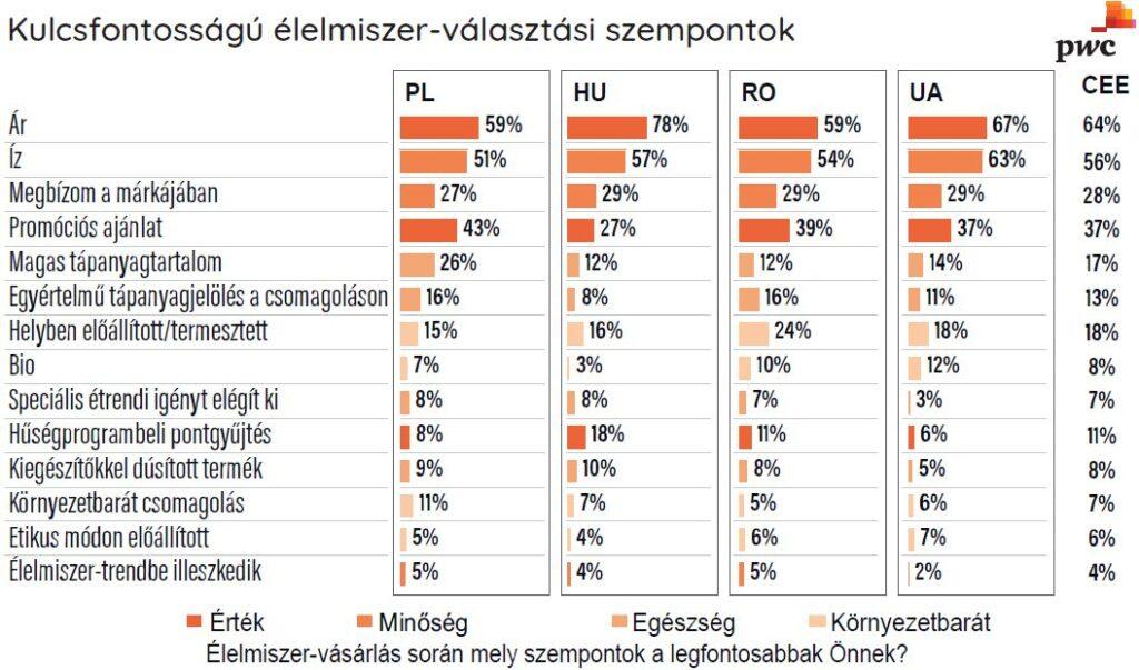 A fentiekből következik, hogy a magyar fogyasztót élelmiszer-vásárlási döntéseiben ma is elsősorban az ár befolyásolja, hiszen főleg a költségekre összpontosít, gyakran diszkont kereskedőknél vásárol és az értékközpontú akciókat keresi. Míg globális szinten a megkérdezettek 51%-a tartja az ár-érték arányt nagyon fontosnak, addig ez Magyarországon közel 80%, de a román vagy lengyel társainkhoz hasonlítva is nagyon-nagyon magas.