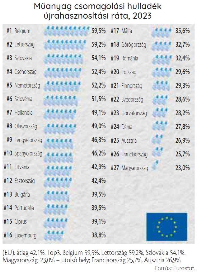 Az uniós újrahasznosítási ráta 2023-ban 42,1% volt (2013: 38,2%), tehát mérsékelt javulás látszik. Országrangsorban Belgium vezet (59,5%), a legalacsonyabb arány Magyarországon (23,0%), mérhető.