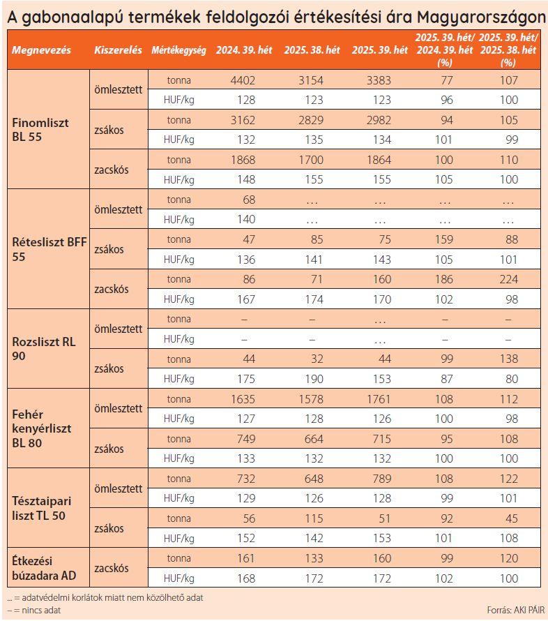 Magyarországon az Agrárminisztérium (AM) tájékoztatása szerint 5,6 tonna/hektáros termésátlaggal 5,4 millió tonna búzát arattak a gazdák 2025-ben. Az AKI PÁIR adatai szerint átlagosan 73,8 ezer forint/tonna áfa és szállítási költség nélküli termelői áron kereskedtek az étkezési búzával szeptember utolsó hetében. Ez az árszint az egy évvel korábbitól 1%-kal maradt el.