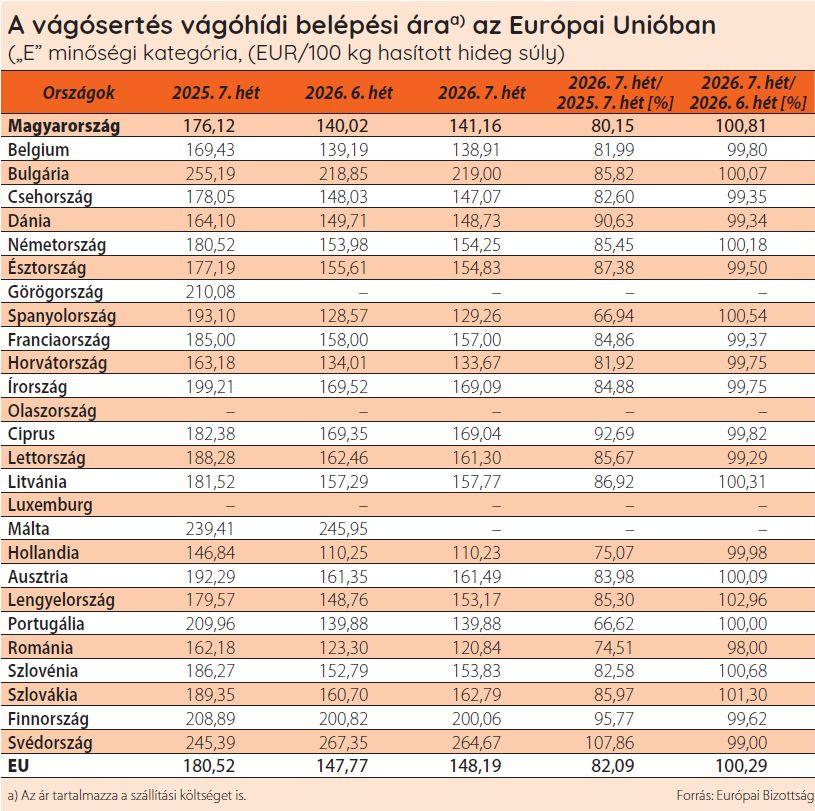Az AKI PÁIR adatai szerint a fiatal bika termelői ára 2297 forint/kilogramm hasított meleg súly volt 2026 1–7. hetében, 15,9%-kal emelkedett az egy évvel korábbihoz viszonyítva. A vágóüsző ára 34,3%-kal, a vágótehéné 31,8%-kal volt magasabb a vizsgált időszakban.