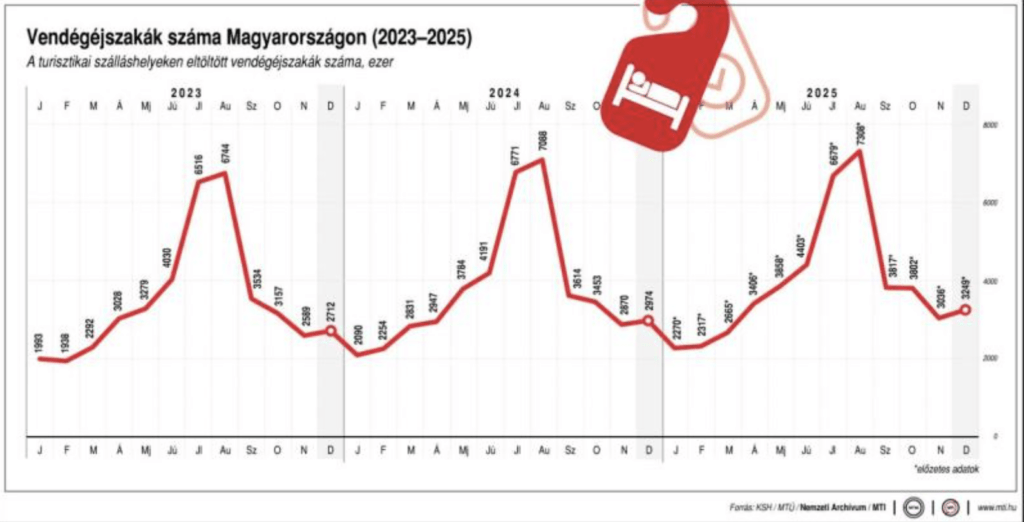 A Központi Statisztikai Hivatal (KSH) és a Nemzeti Turisztikai Adatszolgáltató Központ (NTAK) adatai alapján 2025 decemberében több mint 1,4 millió vendég érkezett a turisztikai szálláshelyekre, ami közel 12 százalékkal múlta felül 2024 azonos időszakának eredményét – idézte az adatokat közleményéhez csatolt háttérben az NGM. A belföldi vendégek száma 604 ezer volt, 10,1 százalékkal több, mint 2024 utolsó hónapjában. Külföldről 819 ezer vendég érkezett, számuk 13 százalékkal múlta felül a 2024 decemberit. A szálláshelyek összesen 3,2 millió vendégéjszakát regisztráltak, ami 9,2 százalékkal volt több, mint 2024 decemberében. A hazai vendégek 1,3 millió éjszakát töltöttek a szálláshelyeken, ez 6,6 százalékkal volt magasabb a 2024 december havinál. A külföldi vendégek által eltöltött közel 2 millió vendégéjszaka pedig 11 százalékkal múlta felül a megelőző év utolsó hónapjának eredményét.
